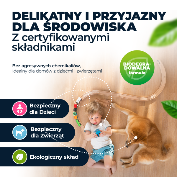 Zaawansowana formuła środka skutecznie usuwa brud, plamy i osady, jednocześnie dbając o delikatne powierzchnie. Możesz go stosować zarówno do podłóg drewnianych, paneli, płytek, jak i powierzchni winylowych, bez ryzyka uszkodzenia powłoki ochronnej.
